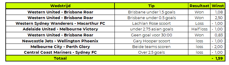 Hopelijk kunnen we net als in de eerste drie speelronden genieten van een succesvolle en winstgevende A-league speelronde. Houd onze onze website goed in de gaten voor toekomstige wedtips. Al onze wedtips vind je ook terug op Facebook en Telegram.