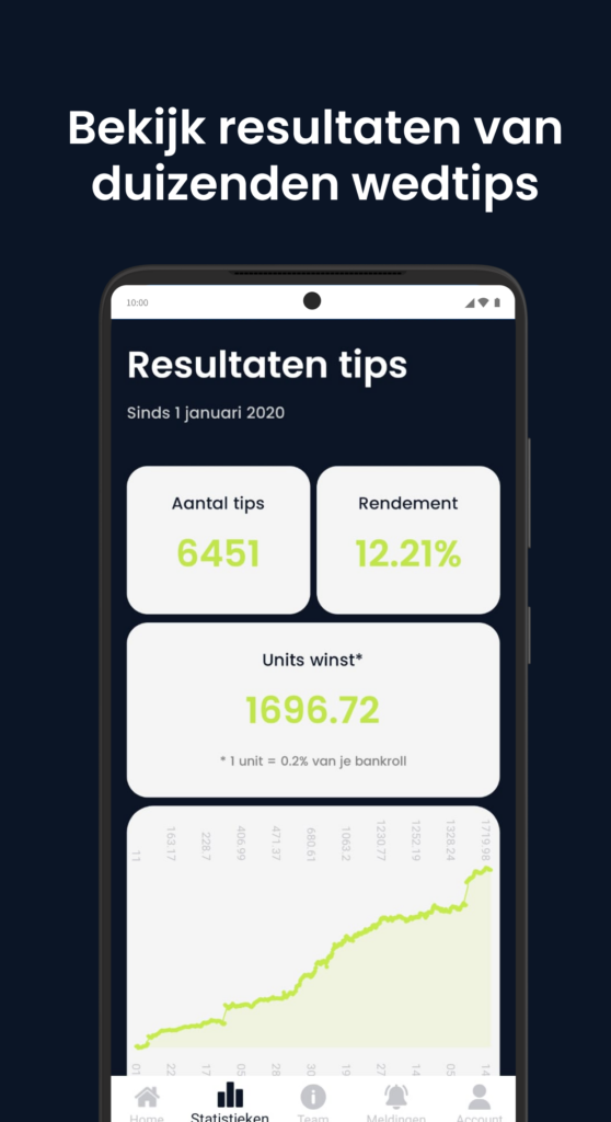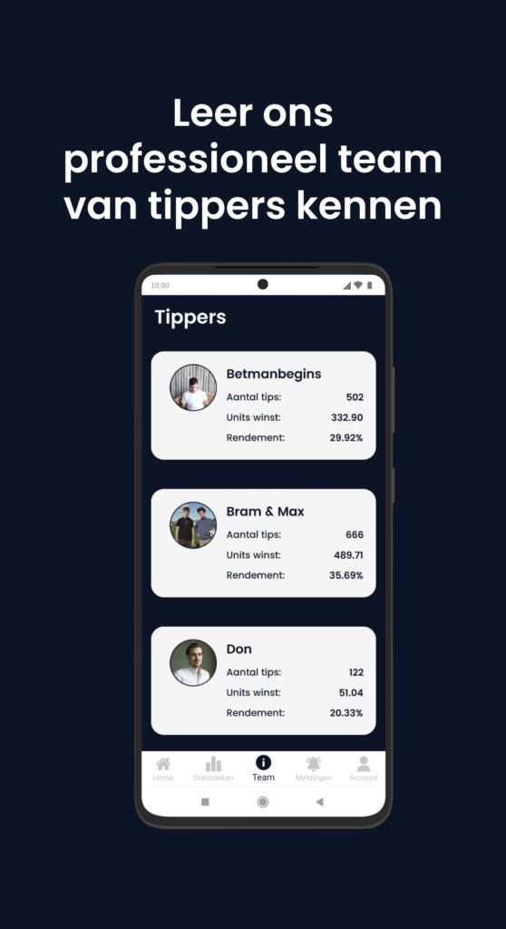 Wil je onze tippers en hun resultaten graag eerst wat beter leren kennen? Dan navigeer je in ons menu simpelweg naar het tabje ‘team’. Hier krijg je in één oogopslag het aantal tips, het aantal units winst en het rendement van elk van onze tippers te zien. Met een simpele klik op de tipper naar keuze bekom je een nog gedetailleerder beeld van zijn resultaten. Daarnaast kom je hier te weten in welke wedmarkten en sporten de tipper in kwestie gespecialiseerd is. En tot slot stellen we ook graag de mens achter de tipper aan je voor.