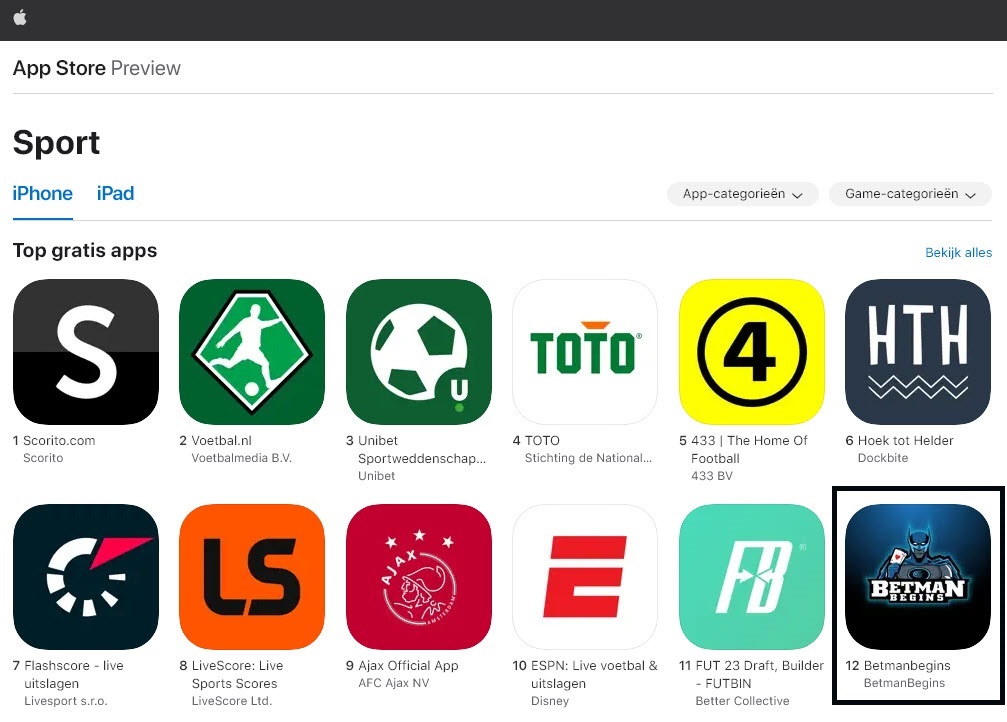 Omdat de Betmanbegins app bij lancering zo massaal gedownload werd, klom hij in de categorie "top gratis sport apps" op tot de 12e plaats in de Apple Store.