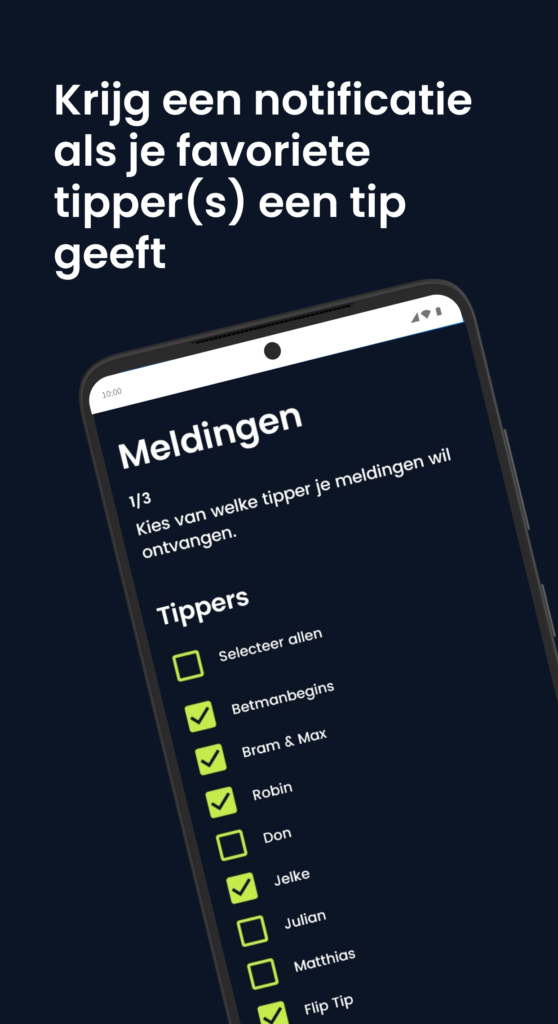 De voornaamste troef van onze applicatie is dat je deze helemaal naar eigen wens kan instellen. Zo kan je er bijvoorbeeld voor kiezen om enkel een pushmelding te ontvangen bij de tips van Bram & Max, Robin en Matthias. Daarnaast kan je aangeven van welke sporten je notificaties wil krijgen. Misschien ben jij wel helemaal verzot op voetbal en darts, maar heb je geen enkele interesse in voorspellingen op andere sporten? Geen probleem! In een handomdraai stel je de meldingen van zowel je favoriete tippers als sporten in.