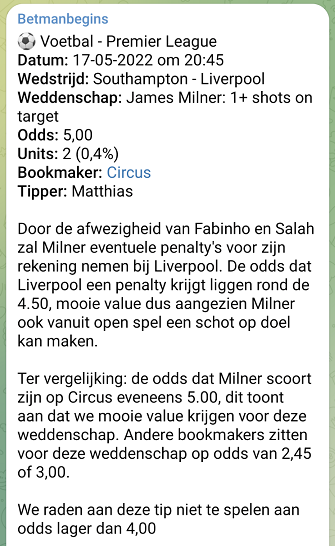 In de maand mei gaven de Betman tippers tot dusver 15 Circus tips met een rendement van maar liefst 27,72%. De mooiste tip was die van Matthias. Onze voetbalkenner gaf dinsdagavond in aanloop naar Southampton – Liverpool aan dat James Milner een eventuele penalty voor zijn rekening zou nemen. De vaste strafschopnemer Mohamed Salah en de nummer twee op het elfmeterlijstje Fabinho werden vanwege blessures immers niet in de selectie opgenomen.