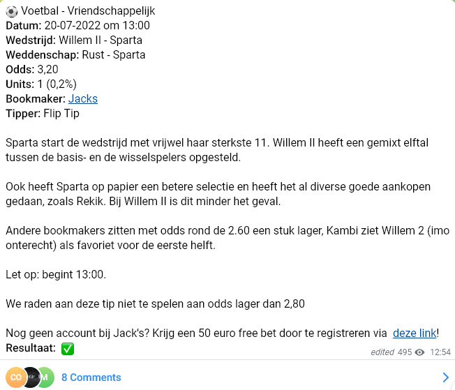 Vorige maand mochten zowel Flip Tip, Bram & Max, Robin als Hannes een vreugdesprong maken toen hun voorspelling met een hoge quotering werkelijkheid werd. Zo wist Flip Tip aan odds van 3,20 correct in te schatten dat Sparta aan de rust op voorsprong zou staan in de oefenpot tegen Willem II. Een erg mooie weddenschap als je een blik werpt op onderstaande argumentatie.