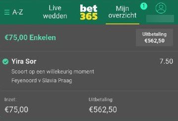“Tot mijn verbazing stond doelpuntenmaker Sor tegen Feyenoord opnieuw te hoog gequoteerd. Wellicht werd hij wederom ten onrechte als middenvelder aanschouwd en zo kon ik deze weddenschap afsluiten aan 7,50 bij bet365. Ter vergelijking: bij andere bookmakers hadden ze de positiewissel wel begrepen en bedroegen de odds gemiddeld 3 voor identiek dezelfde voorspelling”, aldus onze officiële tipper van het Betmanbegins team.