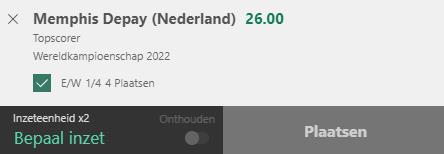 Als je de functie ‘E/W ¼ 4 Plaatsen’ selecteert, dan krijg je een kwart van de odds uitbetaald als Memphis in de top 4 van de topscorer ranglijst eindigt. Dit zouden dus odds van 6.50 betekenen. Omdat het de algemene verwachting is dat Nederland vier à vijf wedstrijden zal afwerken op het WK 2022, acht ik deze kans reëel.