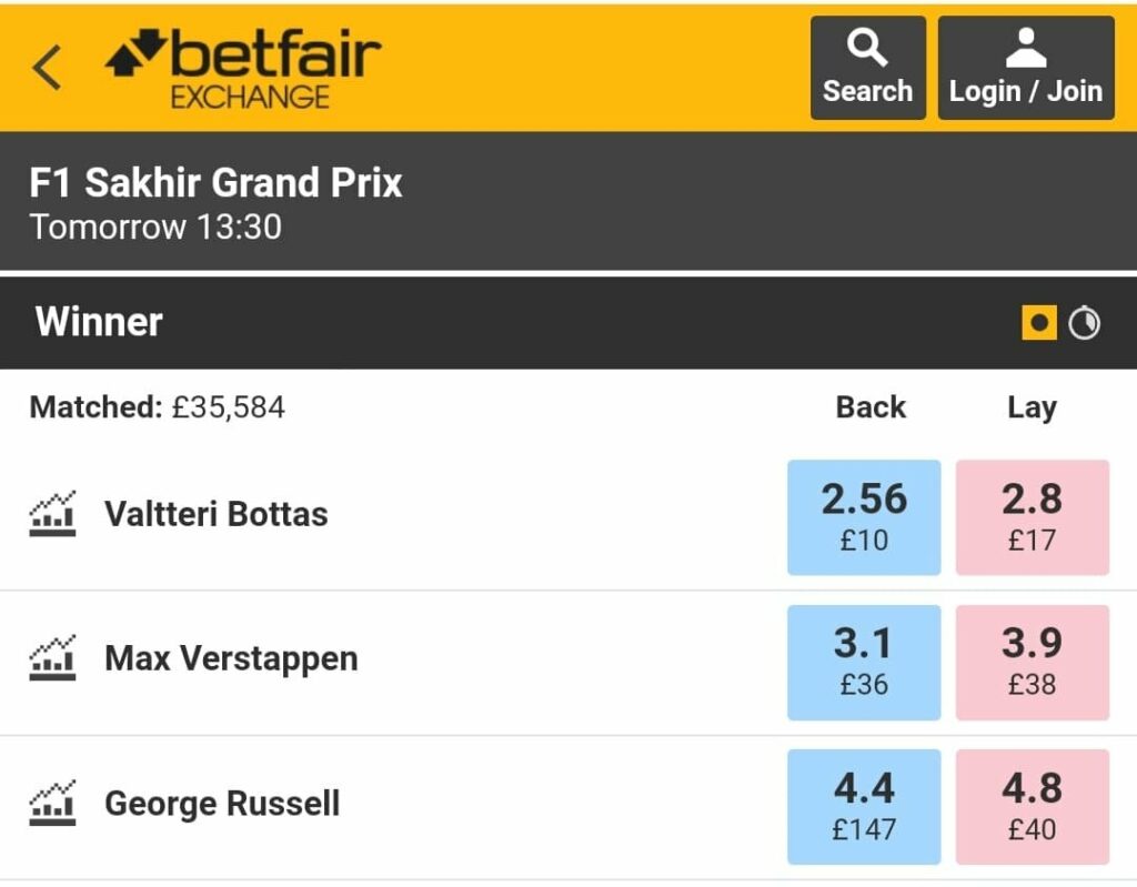 De blauwe ‘Back’ optie geeft de odds aan voor een overwinning van de racer. De roze ‘Lay’ optie geven de odds aan voor als de racer niet wint. Aangezien geen van beide opties zijn ‘gematched’ door andere spelers, zullen de ‘eerlijke’ odds ergens tussen beide opties liggen. Dit zal vooral nauwkeurig zijn wanneer de back en lay odds relatief dicht bij elkaar liggen. Laten we zeggen dat de ‘eerlijke’ odds het gemiddelde zijn van de back en lay odds. Dit wil zeggen dat odds van 2,68 voor een overwinning van Bottas en odds van 4,6 voor een overwinning van Russell de echte waarschijnlijkheid weerspiegelen. Dat komt overeen met odds van 1,69 voor een overwinning van één van beide racers.