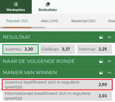 Aanbieders van sportweddenschappen laten geregeld een (flink) verschil in hun quoteringen optekenen. Onderstaand zie je bijvoorbeeld noteringen voor de Coppa Italia tussen Juventus en Inter. Hieruit blijkt dat er tussen de aangeduide groene en rode quotering een groot verschil zit van maar liefst 0,40. Het resultaat van de 1X2 weddenschap “Juventus wint” en “Juventus kwalificeert zich in reguliere speeltijd” is nochtans exact hetzelfde.