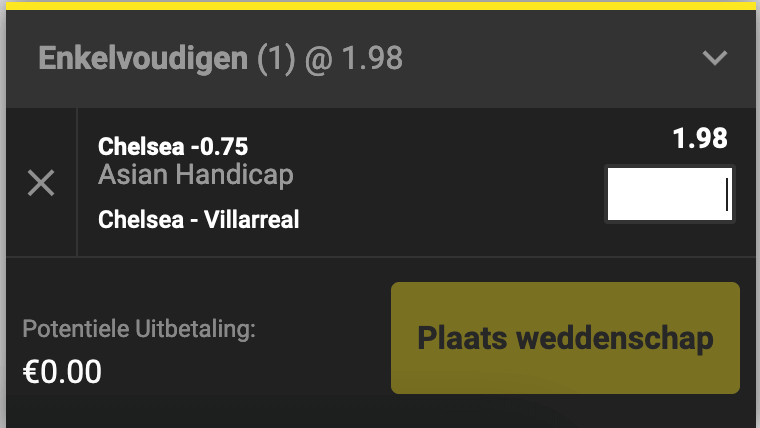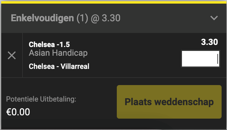 De eerste vorm van Asian Handicap is de halve lijn. In dit geval krijgt het team waarop je wedt steeds een voorsprong of achterstand in de vorm van een veelvoud van 0,5. Laat ons dit even verduidelijken aan de hand van een voorbeeld. We nemen er de UEFA Supercup bij: Chelsea – Villareal. Stel dat je verwacht dat Chelsea ruim wint.