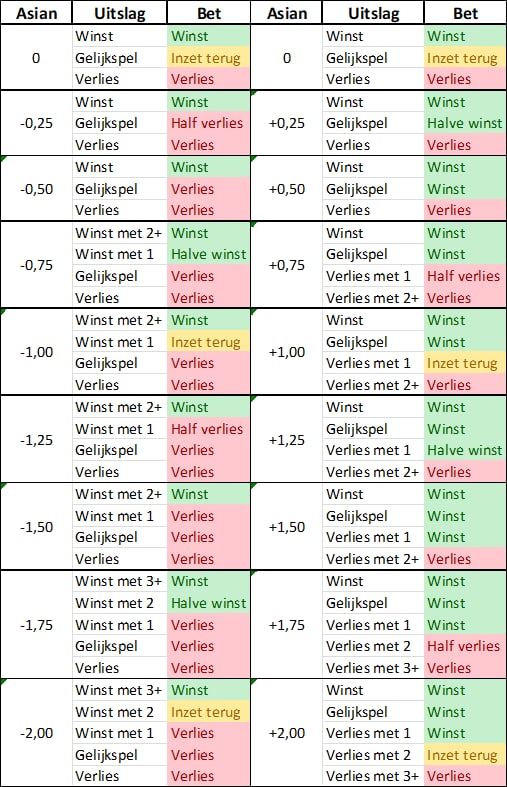 Ben jij ondanks bovenstaande uitleg toch nog niet helemaal mee met de Asian Handicap wedmarkt? Raadpleeg dan onderstaande Asian Handicap tabel. Hierin staan alle soorten Asian Handicaps duidelijk omschreven. Zo zie je in deze overzichtstabel meteen of je weddenschap al dan niet winnend is. Het plusteken in de kolom “Uitslag” staat voor “of meer”: “Winst met 2+” is bijvoorbeeld gelijk aan “Een overwinning met 2 of meer goals verschil”.
