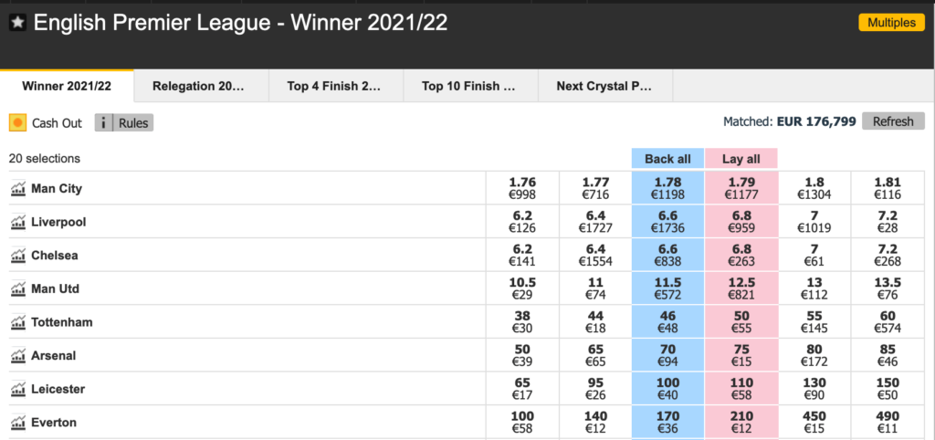 Op onderstaande afbeelding vind je de odds op de Betfair Exchange voor de Premier League 2021/2022. Hetzelfde principe als met een goal van Werner vinden we hier voor het kampioenschap in Engeland. Je kan tegen andere spelers sportweddenschappen plaatsen op wie de Premier League zal winnen. In het blauw vind je de ‘BACK’ en in het rood vind je de ‘LAY’.