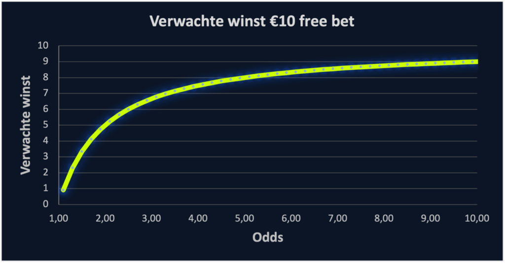 We maakten enkele berekeningen. Zoals je ziet op bovenstaande grafiek, is de verwachte winst van een free bet hoger bij hogere odds. De reden hiervoor is dat je de oorspronkelijke 10 euro van de free bet niet krijgt uitbetaald. Bij inzetten op hoge odds, is het percentage dat je niet krijgt uitbetaald bij winst kleiner. Gemiddeld gezien zal er dus meer winst worden gemaakt bij het inzetten van een free bet op hoge odds. Gemiddeld gezien! Want het risico om te verliezen is natuurlijk ook groter bij hoge odds.