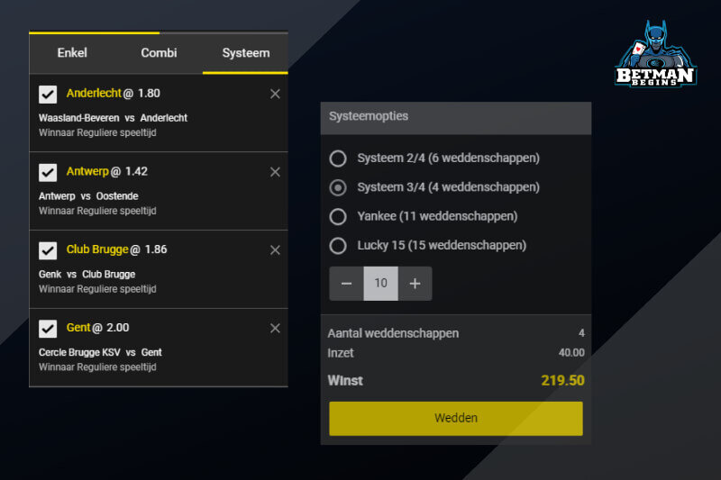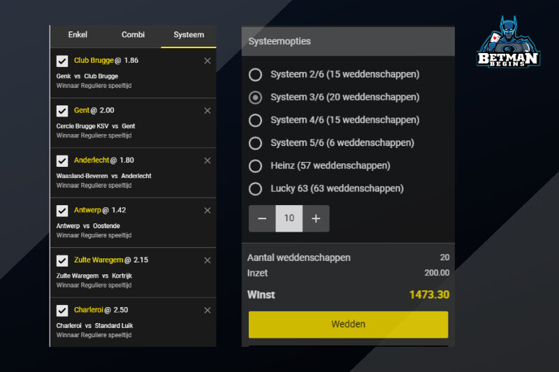 In dit voorbeeld zijn de combinaties: winst Anderlecht en Antwerp, winst Anderlecht en Club Brugge, winst Anderlecht en Gent, Winst Antwerp en Club Brugge, Winst Antwerp en Gent, Winst Club Brugge en Gent. Je kan op elk van deze 6 weddenschappen een bepaald bedrag inzetten. Je totale inzet wordt dus bepaald door het bedrag dat je invult te vermenigvuldigen met 6.