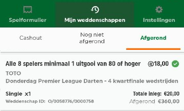 “Dit was dit jaar nog niet gebeurd, maar we waren er wel al een paar keer dichtbij. Zo was er al een avond waarin zeven van de acht Premier League spelers een checkout van 80+ lieten optekenen. Enkel Michael van Gerwen verzaakte toen. Een quotering van 18 leek me dan ook te hoog.”