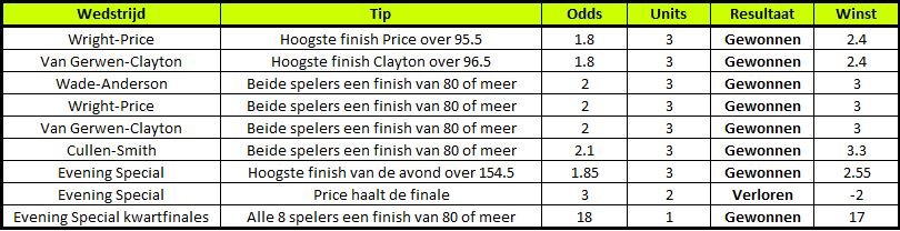 Richard heeft donderdagavond een persoonlijk record neergezet. Een avondje Premier League darts bracht voor onze tipper een winst van maar liefst 33,65 units met zich mee. Een notering van 18 was de kers op de taart.