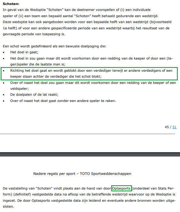 Kort samengevat: enerzijds gebruikt TOTO Opta voor de afhandeling van weddenschappen over schoten, anderzijds telt een geblokkeerd schot volgens hun eigen regels wel degelijk mee als een schot.