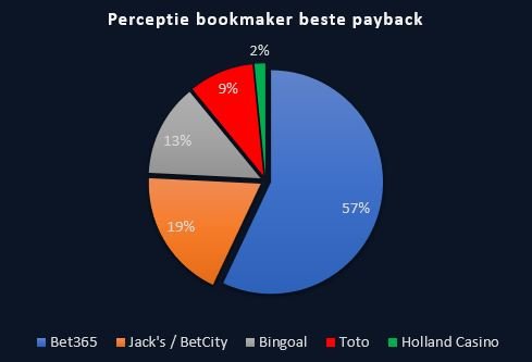 Maar liefst 57 procent van de ondervraagden denkt dat Bet365 de beste uitbetaling heeft van alle Nederlandse bookmakers. Aangezien Bet365 zowel pre-match als live op de derde plaats eindigt en daarmee tot de middenmoot behoort, is dit dus een opvallend gegeven. De zeer matige uitbetaling van Holland Casino wordt correct ingeschat door de spelers.