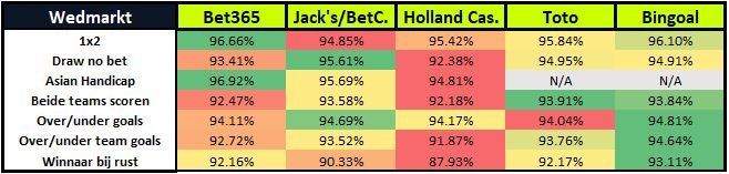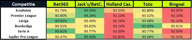 Onderstaande tabel geeft de gemiddelde uitbetaling weer over de vijf gemeten wedmarkten per bookmaker.