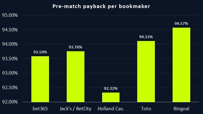 Onderstaande percentages geeft de uitbetaling weer van de odds voor de start van een wedstrijd (pre-match). Later in deze studie gaan we dieper in op de uitbetaling van de odds als de wedstrijd bezig is (live). De uitbetalingspercentages zijn berekend door een gemiddelde te nemen van zeven gemeten wedmarkten op acht verschillende populaire voetbalcompetities. Aangezien zowel Jack’s als BetCity gebruik maken van odds provider Kambi, zijn de odds en dus ook de uitbetaling dezelfde.