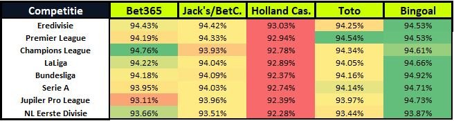 De bovenstaande percentages zijn gemiddelden en daarom is verdere analyse wenselijk. Wij beginnen bij de uitbetaling per competitie. In de onderstaande tabel staan de gemiddelde paybackpercentages (van alle wedmarkten) per competitie. De eerste conclusie die wij hieruit kunnen trekken is dat Holland Casino structureel onderpresteert. Bingoal behaalt daarentegen in elke competitie – met uitzondering van de Champions League en de Premier League – de beste score. In de Champions League en de Premier League wordt Bingoal nipt verslagen door Bet365 en Toto. Deze bookmakers bieden een uitbetaling die respectievelijk 0,15 en 0,01 procent hoger is.