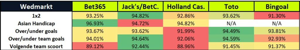 Een eerste vaststelling is de opvallend lage uitbetaling van Bingoal in de 1X2-wedmarkt. Hier liggen zij 3,52 procent lager dan Jack’s en BetCity. Ze scoren ook slechter dan Holland Casino voor 1x2. Net zoals in het pre-match segment scoort Bet365 bijzonder goed in de Asian handicap-wedmarkt. Bij de over/under goals-wedmarkten biedt Toto dan weer een zeer aantrekkelijke uitbetaling aan.