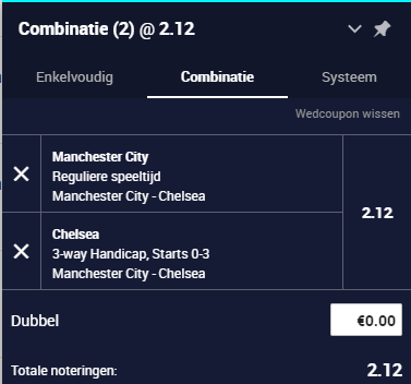 Wedtip: Manchester City – Chelsea: Manchester City wint en Chelsea +3 handicap @2.12 op Betcity en Unibet – 2 units: