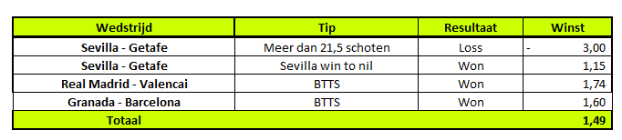 De wedtips vorige week verliepen goed. 3 van de 4 tips waren winnend: Sevilla wist te winnen zonder een goal te incasseren. De wedstrijden tussen Real Madrid vs Valencia en Granada vs Barcelona eindigden in ‘beide teams scoren’. Granada zorgde vlak voor tijd voor de gelijkmaker, waardoor Barcelona (wederom) niet wist te winnen. Al met al leverde dit een winst op van 1,49 units.