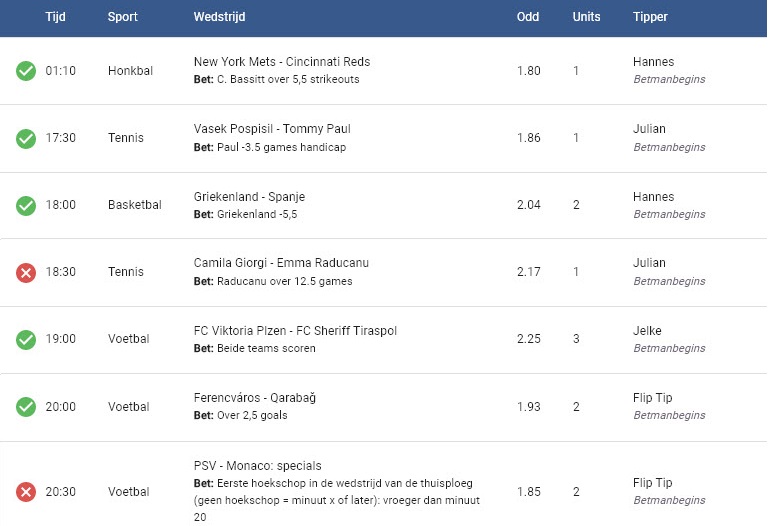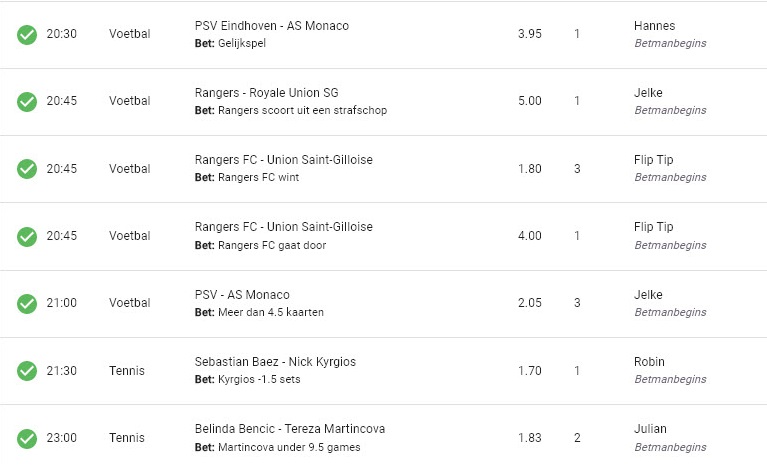 Het mooie aan deze resultaten is dat deze niet te wijten zijn aan één of meerdere uitschieters. Hannes, Julian, Jelke, Flip Tip en Robin droegen allen bij aan deze prestatie. Daarom kunnen we 9 augustus 2022 samenvatten als de mooiste Betman Tippers teamprestatie van het jaar. Onderstaande sportweddenschappen zorgden voor veel blije gezichten in onze community.