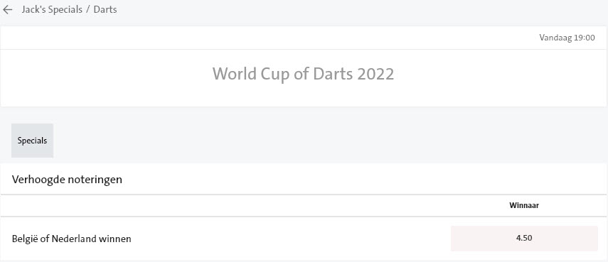 Als jij denkt dat óf Nederland óf België straks de trofee in de lucht mag steken, kan je inzetten op de Jack’s Specials. Hier krijg je een verhoogde notering van 4.50 bij winst voor het duo Noppert – van Duijvenbode of Van den Bergh – Huybrechts.