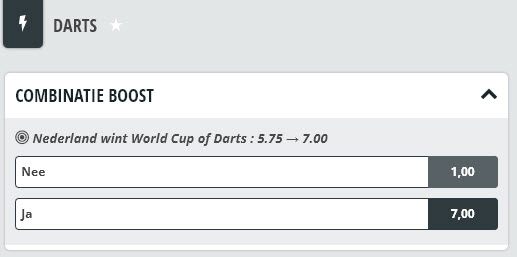 De derde en laatste favoriet bij de bookmakers is Nederland. Michael van Gerwen zal door een operatie aan zijn pols niet meedoen aan de World Cup of Darts, maar met Danny Noppert en Dirk van Duijvenbode kan ons land mooie adelbrieven voorleggen. Op de PDC Order of Merit gaat het immers om de nummers 11 en 14 van de wereld. Als jij gelooft in een oranje feestje doe je er goed aan om in te zetten op de zeer aantrekkelijke super odds van ZEbet. Zij verhogen hun notering op "Nederland wint" van 5,75 naar 7.