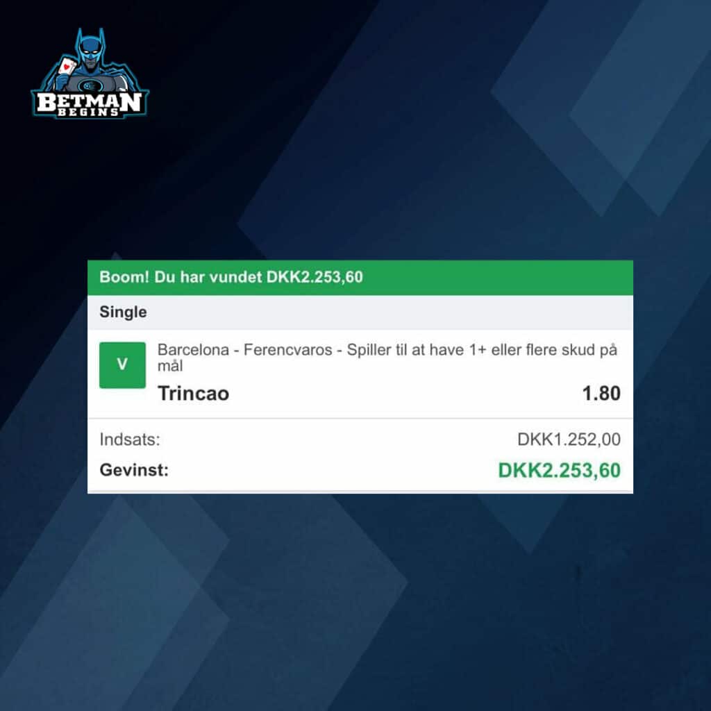 Een tweede tip was dat er meer dan 10,5 corners zouden zijn in de wedstrijd Chelsea vs Sevilla. Helaas kwamen we hier enkele corners te kort. Wellicht had een doelpunt geleid tot aanvallender spel en meer corners. Tot slot tipten Bram & Max dat Trincao op doel zou schieten in de wedstrijd Barcelona vs Ferencvaros. Dit gebeurde al in de eerste helft en ook dit was een winst, tot vreugde van een Deense volger van de Engelstalige Betmanbegins Telegram groep.