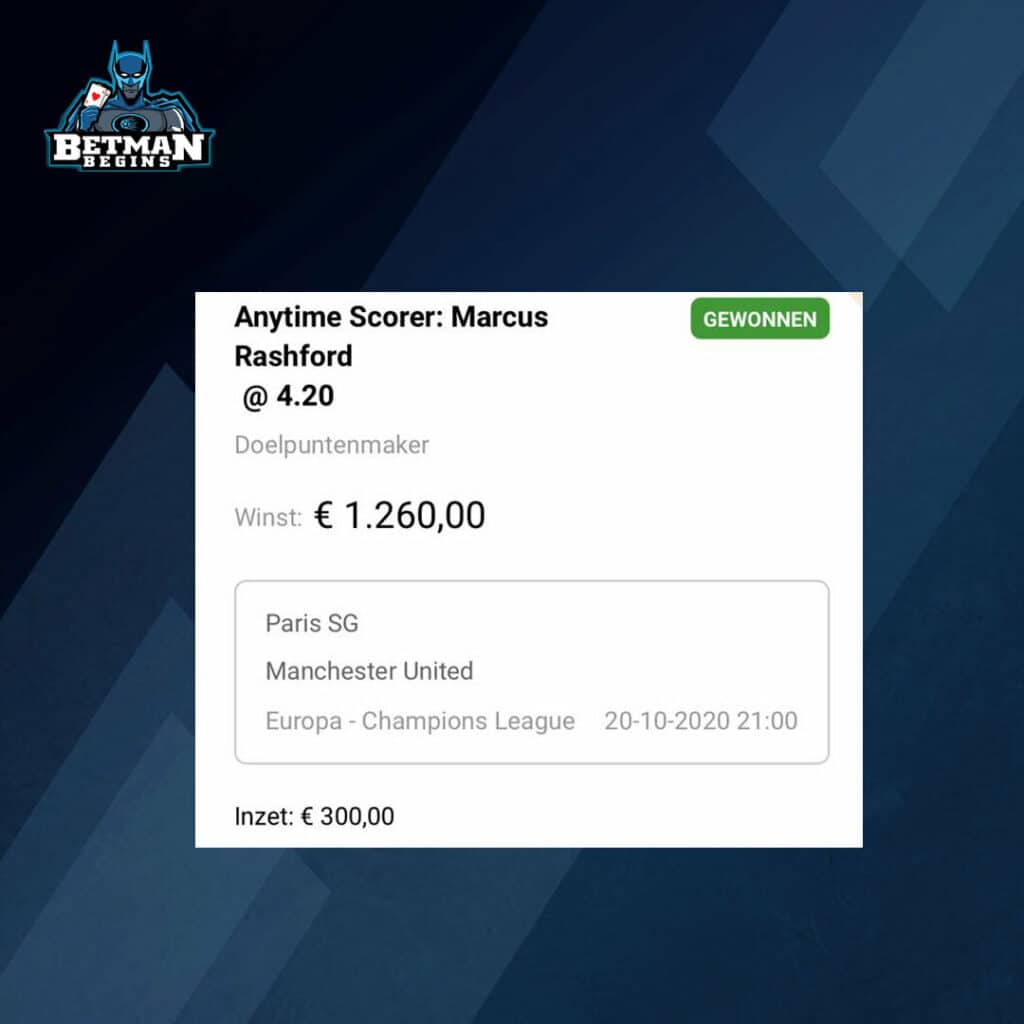Wijzelf hadden getipt dat Vanaken zou scoren tegen Zenit aan odds van 5,25. Hij had een mooie kans bij het einde van de eerste helft, maar de keeper maakte een knappe redding op zijn kopbal. Hier zijn we helaas één unit verloren. De andere tip was veel succesvoller. Het plaatsen van twee aparte tips (Rashford scoort in eerste helft + rashford scoort in tweede helft) leverde hogere odds op dan hem als doelpuntenmaker. Zijn prachtige doelpunt in de tweede helft leverde een winst op met odds van 9,00! Een volger besloot om ook een weddenschap te plaatsen op ‘anytime goalscorer’ aan odds van 4,20. Mooie winst!