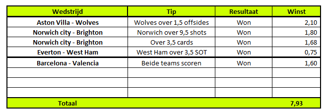 Ja ja, een unicum! Alle wedtips die gegeven werden in de voorbeschouwing op Engeland en Spanje afgelopen weekend waren juist. Norwich wordt een zeer interessante ploeg om in de gaten te houden de komende weken als het gaat om teamshots, ze behaalden er maar liefst 15. De lijn ligt daar duidelijk een stuk te laag steeds.