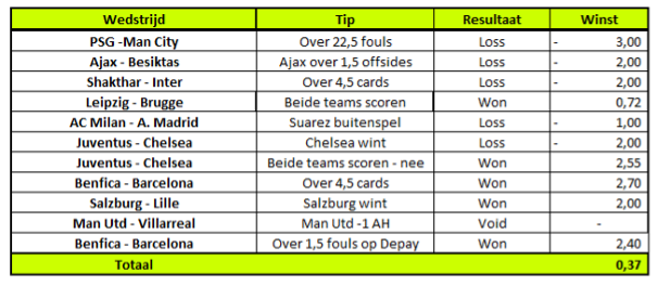 De Champions League begon qua wedtips bijzonder matig. De tips van dinsdag waren vrijwel allemaal fout, enkel Brugge en Leipzig wisten beide te scoren, helaas was hier maar 1 unit getipt. Uiteindelijk is er dinsdag 7,28 units verlies gedraaid. Woensdag was een betere dag. Deze dag heeft alles goed gemaakt. Enkel Chelsea wist niet te winnen, maar de uitleg bij beide teams scoren – nee was juist. Juventus loerde op de counter en won met 1-0. Woensdag was er een winst van 7,65 units wat de totale winst van de Champions League op 0,37 units brengt.