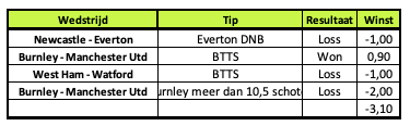 Vorige week door wat drukte helaas niet toegekomen aan een artikel, vandaar de resultaten van 2 weken geleden nog even. Burnley begon helaas pas in de 2e helft met voetballen. Hierin had het 9 schoten tegenover 0 in de eerste helft. Everton en Watford werden compleet verkeerd ingeschat en waren vrij kansloze losses. Al met al 3,10 units verlies.