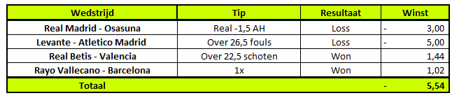 Real Madrid wist niet haar gewenste niveau te halen waardoor ook die weddenschap verloren ging. De wedstrijd tussen Betis en Valencia was zoals voorspeld een aardig open wedstrijd, met de nodige schoten. Ook de zwakte van Barcelona werd juist ingeschat. Er werd met 1-0 zeer teleurstellend verloren van Rayo Vallecano, wat uiteindelijk zorgde voor het ontslag van Koeman. Helaas waren de hogere units op de verliezende tips, wat voor een verlies heeft gezorgd van 5,54 units.