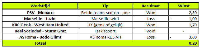 Gisteren werd er op de Europa + Conference League een winst geboekt van 0.20 units, voor zover je het winst mag noemen. Isak begon op de bank dus werd een void, Monaco – PSV was een doodsaaie wedstrijd die in 0-0 eindigde. Er werd zelfs niet eens op doel geschoten! Genk wist te ‘stunten’, terwijl AS Roma (wederom) enorm teleurstelde. Met 3 units is dit de boosdoener geweest.