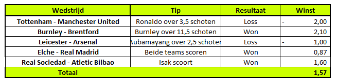 De wedtips in Spanje en Engeland zijn vorig weekend op een winst van 1.57 units uitgekomen. Enkel de 2 playerpicks omtrent de schoten gingen verloren. Burnley viel makkelijk binnen, Elche scoorde met ietwat geluk in de laatste minuten en Isak kwam tot scoren.