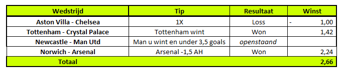 Op het moment van typen staat er nog 1 wedtip open. Manchester United speelt vanavond nog tegen Newcaslte. Dat resultaat wordt volgende week verwerkt. Op Boxing day is er een winst behaald van 2,66 units. Aston Villa leek goede zaken te doen toen het op voorsprong kwam, echter wist Chelsea de wedstrijd om te buigen. Tottenham won eenvoudig van Crystal Palace. Terwijl Arsenal uithaalde bij Norwich: 0-5.
