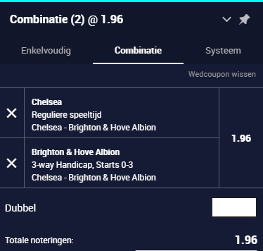 Wedtip: Chelsea – Brighton & Hove Albion: Chelsea wint + Brighton +3 handicap @1.96 op Unibet, Betcity en Jacks – 1 unit: