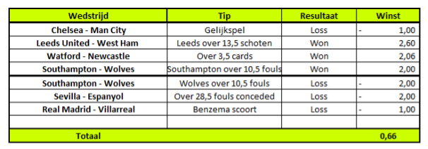 Dan de resultaten van de wedtips van de wedstrijden in Spanje en Engeland vorige week. In Engeland ging het (wederom) erg goed. Ik zal mijn tips vanaf nu meer focussen op de Premier League dan La Liga. In La Liga waren beide tips namelijk weer verliezend. Uiteindelijk werd er een winst geboekt van 0,66 units. Dat brengt het totale resultaat van de wedtips op +2,33 units!