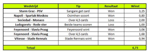 In de Champions League werden dinsdag en woensdag 0,37 units winst behaald. In de Europa League en Conference League zijn daar donderdag avond nog 6,73 units winst bijgekomen. Vrijwel alle tips waren juist. 1 zuur geval: 1 kaart tekort bij Monaco – Sociedad. De totale winst van de midweekse Europese speelronde bedraagt 7,10 units.