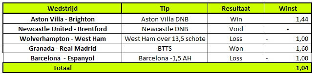 Vorige week is er een kleine winst behaald van ruim 1 unit. Helaas wist West Ham aanvallend zeer weinig te creëren en won Barcelona slechts met 1-0. Newcastle maakte maar liefst 3 goals, maar het was niet genoeg voor de winst: 3-3 tegen Brentford.