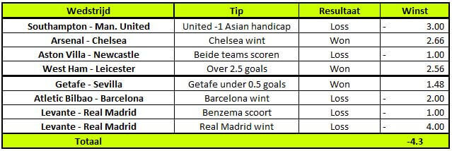 In Spanje ging het een stuk minder. Waar vorige week alle grootmachten wonnen, gingen Barcelona en Real Madrid ditmaal onderuit. Real Madrid scoorde 3 keer, maar helaas was daarvan geen enkele goal van Benzema. Getafe wist het net niet te vinden, wat de enige win in het zuiden van Europa opleverde. Hopelijk wordt dat deze week wat beter.
