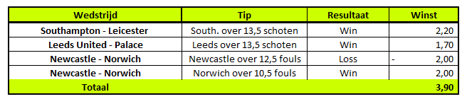 De wedtips van het doordeweekse programma in Engeland afgelopen week zijn goed uitgepakt. Southampton en Leeds behaalden beide redelijk ruim de lijn omtrent de schoten. Dit zorgde voor twee lekkere wins. Op de overtredingen bij de degradatiekraker tussen Newcastle United en Norwich werd quitte gedraaid, Newcastle behaalde de lijn van minstens 13 overtredingen vrij ruim niet, Norwich behaalde er precies 11. Uiteindelijk is er een winst behaald van 3,90 units.