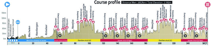 Het parcours in België bestaat uit drie delen: een vlak stuk van Antwerpen naar Leuven, deze wordt een keer verreden en heeft een afstand van 56 kilometer. Het Leuven-circuit dat drie keer wordt verreden. En het Flandrien-circuit dat twee keer verreden wordt.