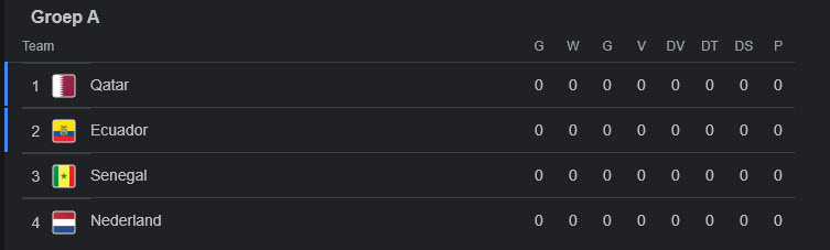 Bij zowat iedere legale bookmaker in Nederland zal je kunnen inzetten op wie de groepsfase als leider zal afsluiten, maar ook wie als tweede weet door te stoten. Het WK voorspellen begint dus al vóór de knock-outfase! In onderstaand stukje staat de notering voor groepswinst tussen haakjes achter de favoriet(en) per groep. Deze quoteringen zijn afkomstig van Unibet en dateren van begin augustus 2022. Als jij deze tekst op een later moment leest, wees je er dan van bewust dat odds fluctueren doorheen de tijd. Als Virgil van Dijk, Frenkie de Jong en Memphis Depay straks geblesseerd moeten afhaken, spreekt het voor zich dat de noteringen op Nederland zullen stijgen.