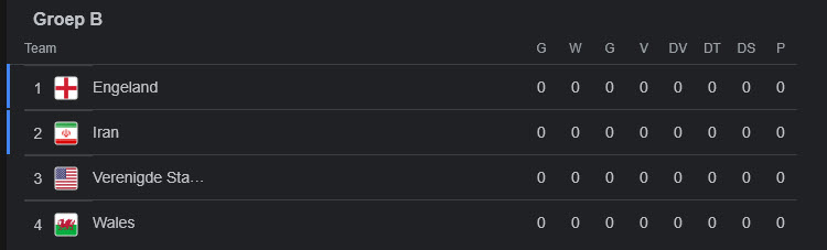 Als Nederland effectief zijn groep winnend weet af te sluiten, mogen we ons opmaken voor een wedstrijd tegen de tweede uit groep B. In die groep vinden we Engeland, Iran, de VS en Wales terug. Dat Engeland groepswinnaar wordt, staat in principe buiten kijf. Het lijkt dan ook tussen Wales en de VS te gaan als mogelijke tegenstander van Oranje in de achtste finales. Ook deze twee ploegen zouden een haalbare kaart moeten zijn voor Nederland.